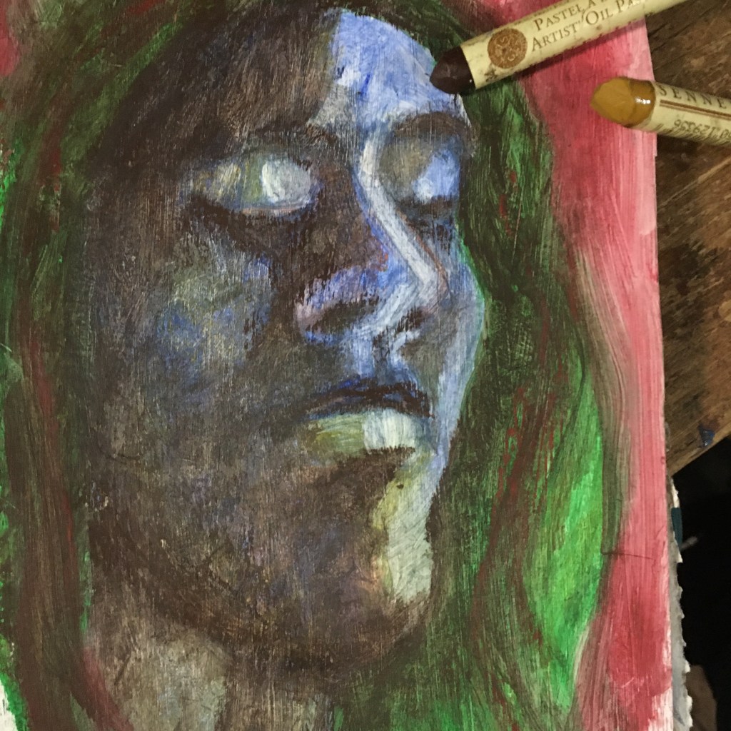 Today I’ve be working with the oil pastels and white spirit on gessoed paper. It’s changed how the colours took to the paper, some of it good, some of it not so good.